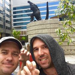 Walk past the Gado-shita and Yurakucho station and you get to the (newly revamped) Godzilla statue near Hibiya station. It's 3 metres high but it feels quite small because it's on a large base surrounded by lots of little old ladies taking photos. At first it looks like it has guards to protect it from the fans, but it's really to make sure no one gets run over since it stands over the entrance to an underground car park.