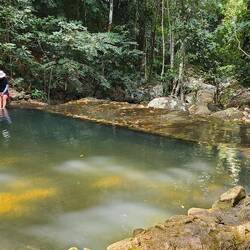 Our first stop, once we arrived, was to a waterfall in one of the national parks. Apparently, 2/3 of this island is parkland. The waterfall was not large, but was very pretty and fed a small pool at the bottom of it inhabited by those little fish that nibble at your feet. Maybe you have seen those little shops, in your travels, that invite you to immerse your feet into a tank of water filled with these little 'pedicure' fish. We've actually paid for the experience in the past! The old boy got another one free today!!