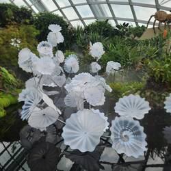 In demselben Park in der Nähe am Wasser stehen zwei große Topenhäuser aus Glas.
