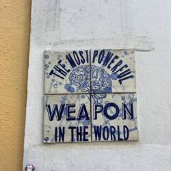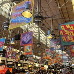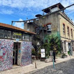 Am Praça do Comércio angekommen, wurde schnell klar, warum dieser Platz historisch so wichtig war. Früher war er einer der zentralen Handelsplätze der Stadt, direkt am Ufer des Tejo gelegen. Händler aus aller Welt kamen hier an, Waren wurden verladen und verteilt. Heute ist der riesige Platz mit seinen gelben Gebäuden und den Arkaden vor allem ein beeindruckender Treffpunkt für Besucher – und ein perfekter Ausgangspunkt für Spaziergänge entlang des Flusses. Genau das machten wir auch: Wir liefen die Promenade am Wasser entlang bis zum berühmten Time Out Market. Der Food Market ist eigentlich eine Art kulinarische Markthalle mit vielen verschiedenen Ständen bekannter Köche und Restaurants. Unsere Erwartungen waren entsprechend hoch – leider wurde es kulinarisch wieder nur „okay“. Nicht schlecht, aber auch nicht das große Geschmackserlebnis, auf das wir gehofft hatten. Also zogen wir weiter Richtung LX Factory. Die LX Factory ist ein ehemaliges Industrieareal unter der großen Brücke des 25. April, das heute zu einem kreativen Viertel umgebaut wurde. Früher standen hier Textil- und Druckereifabriken, heute findet man dort Designläden, kleine Boutiquen, Kunstgalerien, Restaurants und Cafés. Die Gebäude sind mit Street Art bemalt, überall gibt es kreative Ecken – eine Mischung aus Industriecharme und Kunstszene. Bevor wir losstöberten, machten wir erstmal eine Pause auf einer Rooftop-Bar und genossen die Sonne. Genau das Richtige nach den letzten Tagen voller Lauf, Muskelkater und Stadtspaziergängen. Danach bummelten wir durch die verschiedenen Läden. Viele verkauften lokale Produkte, Designartikel, Bücher oder Kunst – insgesamt eine richtig coole Atmosphäre, die sich deutlich vom restlichen Stadtzentrum unterscheidet. Zurück ging es diesmal tatsächlich mit dem Bus – diesmal wussten wir ja, dass man die Hand heben muss. Am Nachmittag wartete dann das eigentliche Highlight des Tages: