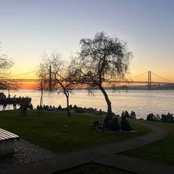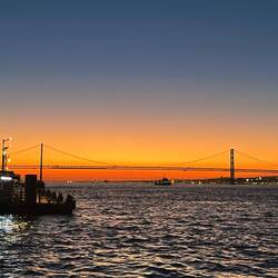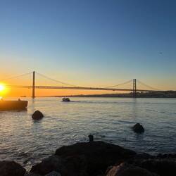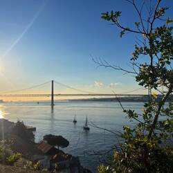 Das Ganze fand direkt am Wasser statt, mit Blick auf die beeindruckende Brücke des 25. April, die mit ihrer roten Farbe ein bisschen an die Golden Gate Bridge erinnert. Eine ziemlich spektakuläre Kulisse.