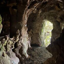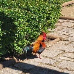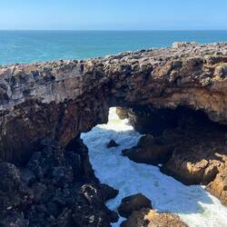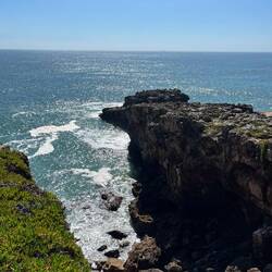 Wir spazierten zunächst durch den Ort und landeten schließlich in einem großen Park direkt an der Küste. Dort war überraschend viel Leben – allerdings nicht nur menschliches. Wir entdeckten freilaufende Hühner und Hähne, stolzierende Pfaue und sogar Schildkröten. Zwischen alten Bäumen, kleinen Wegen und vielen Sitzgelegenheiten war es ein richtig schöner Ort zum Verweilen. Es gab sogar Spielplätze – und einen davon haben wir natürlich kurz selbst ausprobiert. Unser eigentliches Ziel lag aber noch ein Stück weiter: die Boca do Inferno – übersetzt „Höllenschlund“. Dabei handelt es sich um eine spektakuläre Felsformation und Meereskluft, in die die Wellen des Atlantiks mit großer Wucht hineinschlagen. Die Felsen sind dramatisch geformt, und direkt darüber stehen beeindruckende Häuser in bester Meerblick-Lage. Natürlich kamen wir wieder kurz ins Träumen: Wie wäre es wohl, hier zu wohnen? Schön. Definitiv schön.