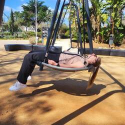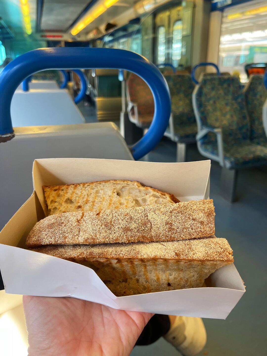 Nach so viel Küstenluft brauchten wir eine kleine Belohnung – also gab es wieder einmal eine Kombination, die sich langsam zu unserem Portugal-Ritual entwickelt: Eis und Pastel de Nata. Am frühen Nachmittag machten wir uns wieder auf den Rückweg nach Lissabon. Die Zugfahrt nutzten wir beide für ein kleines Nickerchen, was nach den letzten aktiven Tagen definitiv gut tat. Zurück in der Stadt beschlossen wir spontan, noch einen weiteren Ort zu erkunden: Almada. Die kleine Stadt liegt direkt gegenüber von Lissabon auf der anderen Seite des Tejo. Mit der Fähre dauert die Überfahrt nur etwa acht Minuten – und man bekommt dabei einen tollen Blick auf die Skyline von Lissabon und die Brücke des 25. April.