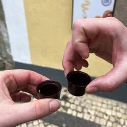 Hop-on-Hop-off-Bus, Free Walking Tour, Bootstour, Afternoon Tea… alles klang gut, aber nichts passte so richtig zu unserem aktuellen Zustand. Also entschieden wir uns für die vermutlich sinnvollste Option nach einem Halbmarathon: planlos durch die Stadt treiben lassen. Nach einem weiteren – für unsere Beine gefühlt endlosen – Spaziergang mit ungefähr „10.000 Höhenmetern“ landeten wir schließlich in einem weiteren Café, die laut New York Times einen „teuflisch guten Schokoladenkuchen“ haben soll. Natürlich mussten wir das testen. Unser Urteil: approved. Danach schlenderten wir durch verschiedene kleine Läden – besonders Keramik und die berühmten bunt verpackten portugiesischen Sardinen gibt es hier an jeder Ecke. Irgendwann meldete sich wieder der Hunger, naja eher die Lust. Also probierten wir eine kleine portugiesische Spezialität: Bacalhau-Käsebällchen mit Portwein. Eine absolute Touristenattraktion – aber tatsächlich ziemlich auch lecker. Unser eigentliches Tagesziel war allerdings ein anderes.