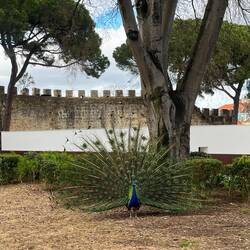 Die Festung stammt ursprünglich aus der maurischen Zeit im 11. Jahrhundert und war später lange Zeit königliche Residenz. Durch ihre Lage auf dem höchsten Hügel der Altstadt hat man von dort einen fantastischen Panoramablick über Lissabon, den Tejo und die roten Dächer der Stadt. Wir schlenderten durch die alten Mauern, liefen über die Aussichtspunkte und hörten nebenbei den Audio-Guide, der ein bisschen über die Geschichte der Burg erzählte. Mindestens genauso auffällig wie die Architektur waren allerdings die Pfauen, die frei über das Gelände laufen. Und die machten sich auch lautstark bemerkbar. Ihr Kreischen klingt erstaunlich ähnlich wie eine Katze, der jemand auf den Schwanz getreten ist – ziemlich skurril, aber auch irgendwie beeindruckend. Und schön sind sie natürlich sowieso. Nach dem Besuch liefen wir hinunter durch Alfama, eines der ältesten Viertel von Lissabon. Enge Gassen, kleine Treppen, Wäscheleinen zwischen den Häusern – genau das Postkarten-Lissabon. Natürlich brauchten wir unterwegs wieder eine kleine Stärkung. Also stoppten wir für ein Pastel de Nata, die 2019 angeblich das beste Pastel de Nata der Stadt gewesen sein sollen. Und ja – es war wirklich sehr gut. Unser eigentliches kulinarisches Ziel war aber ein anderes: Bifana. Das ist ein klassisches portugiesisches Sandwich mit mariniertem Schweinefleisch, meist in einem einfachen Brötchen serviert. Vor ein paar Tagen hatten von einen Laden berichtet, vor dem eine riesige Schlange stand – damals hatten wir noch gelacht, dass manche Leute über 30 Minuten für ein Sandwich warten. Heute waren wir dann selbst die Dödel, die sich dort anstellten. Um die Wartezeit zu überbrücken, holten wir uns schon einmal Pommes bei „The Potato Project“. Die waren wirklich hervorragend – knusprig, gut gewürzt, richtig gut. Und das Bifana?