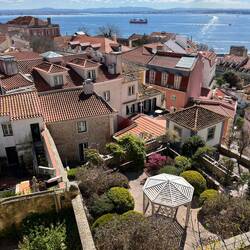 Anschließend setzten wir uns noch mit Kaffee und frisch gepresstem Orangensaft an einen der vielen Aussichtspunkte der Stadt, den Miradouro de Alcântara. Von dort hat man einen tollen Blick über die Dächer von Lissabon.
