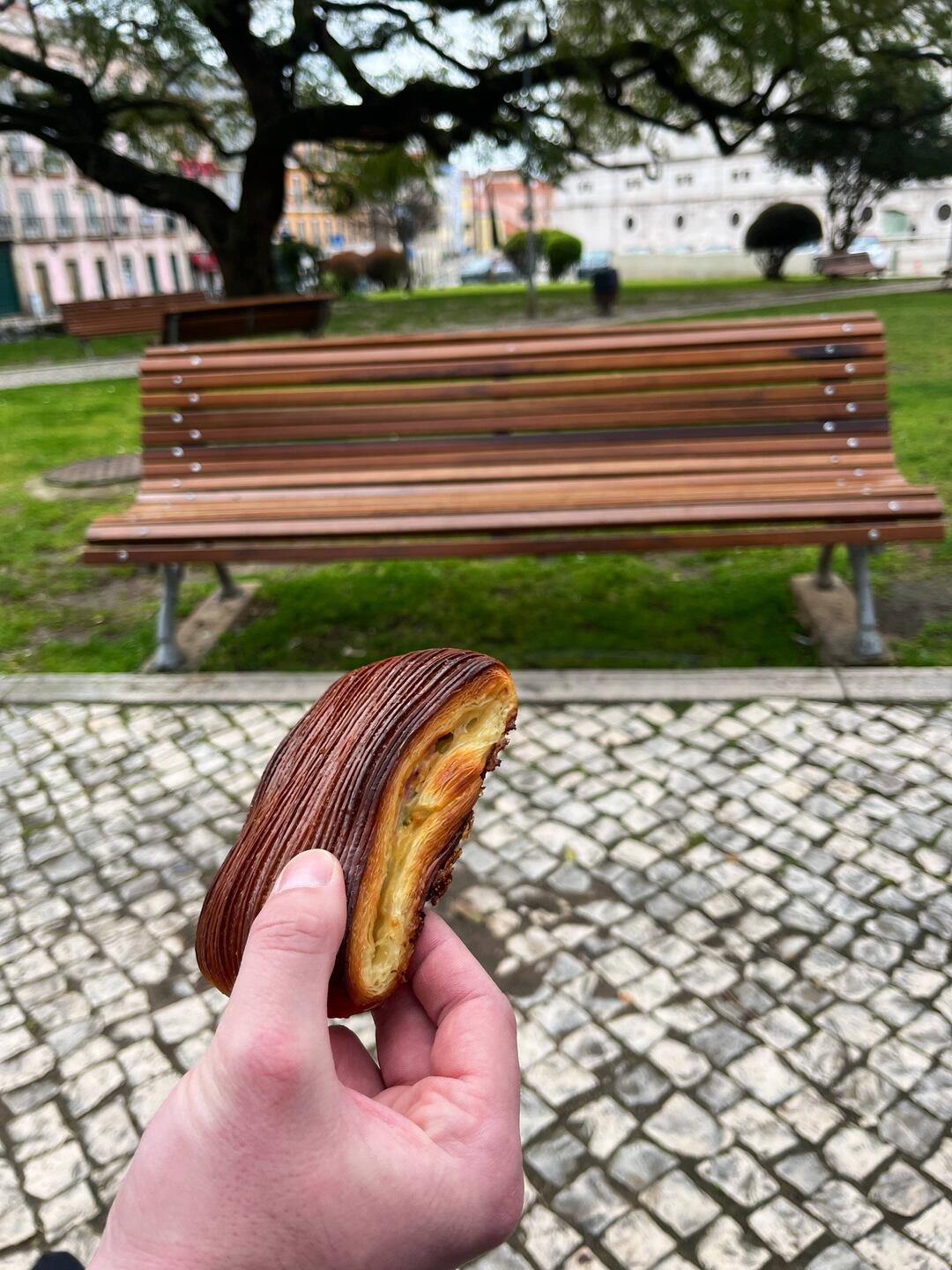 Unser letzter ganzer Tag in Lissabon begann ganz entspannt. Morgen geht es schon wieder zurück – also wollten wir den Tag noch einmal bewusst genießen. Zum Frühstück gingen wir zu Chez Croissant, einem kleinen Café mit einer Auslage voller wunderschöner Croissants im Schaufenster. Die Entscheidung fiel uns schwer, deshalb nahmen wir einfach eins herzhaft und eins süß. Gute Entscheidung – beide waren lecker.