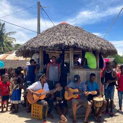 Der nächste Halt war ein Punkt an dem man Baobabs bzw. Affenbrotbäume sehen konnte. Natürlich warteten auch hier Kinder und Frauen. Dieses Mal kaufte ich einem Jungen zwei kleine Affenbrotbäume aus Holz ab. Ich hab mich gefreut. Der Junge glaube ich auch. Foto geschossen und weiter. Der nächste und auch letzte Halt war der Strand von Ramena. Uns erwartete aber nicht nur der Strand, sondern auch ein Empfang der Einheimischen mit Musik und Buffet. Ich habe alles probiert. Natürlich. Besonders haben mir die Litschis geschmeckt. Ich war eigentlich nie ein Litschi-Fan, aber nun bin ich es. Ich habe meine Füße noch in den indischen Ozean gehalten und dann sind wir zurück zu unserem Minibus. Der Strandabschnitt mit seinen Fischerbötchen und den ganzen Krebsen war echt ganz hübsch. Auf dem Rückweg hielten wir noch in der Stadt, ‚Stadt‘. Der erste Gang führte in den Supermarkt mit der ersten Mission: Schokolade. Die zweite Mission: Wasser. Das einzige, das auf dem Schiff wirklich belastend ist (für mich), ist, dass es außerhalb der Mahlzeiten kein Wasser gibt. Stopp. Es gibt Wasser, das käuflich zu erwerben ist. 3,64€ für 0,75L. Buh! Also gab es abgesehen von madagassischer Schokolade, auch 9 Liter madagassisches Wasser. Ein Traum! Zurück auf’n Schiff erholten wir uns erstmal und verbrachten den Abend mit leckerem Essen und Pianotainment. Wir konnten allerdings nicht pünktlich ablegen, weil ein Ausflugs-Jeep mit 4 Insassen verschollen war. Ohne Reiseleitung, ohne Kontakt. Ich glaube, die Besatzung hatte leichte Panik, dass die 4 entführt wurden oder verunglückt sind und wiederholten mehrmals, dass sie hoffen, dass alle heile wieder an Bord gelangen. Madagaskar ist eben ein Abenteuer. Es sind aber zum Glück alle wieder unversehrt angekommen, sodass wir dann doch irgendwann ablegen konnten.