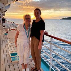 Nach dem Frühstück gingen wir zur Tuchbindeshow, in der wir nicht zur ein Glas Sekt mitnahmen, sondern auch Eindrücke wie man das Strandtuch noch binden könnte. Anschließend ging es zum Frühshoppen in die Außenbar, wo wir den Klängen von Jazz lauschten. Es war unfassbar heiß, 35 Grad und es ging wirklich kaum Wind..wir schmolzen nur so dahin! Nach unserem ‚leichten‘ Mittag ging die Völlerei erst richtig los. Das Motto der heutigen Kaffee & Kuchenstunde hieß ‚Alles Schokolade‘ - Halleluja, das war definitiv alles Schokolade, sodass uns danach selbstverständlich schlecht war. So muss das sein. Obwohl wir uns dieses Mal ganz fest vorgenommen haben zu gewinnen, hatten wir auch heute kein Glück beim Bingo, obwohl ich in der letzten ‚Rückwärtsrunde‘ den 2. Platz gemacht habe. Hat aber trotzdem nicht gereicht. Mit vollem Magen haben wir uns ans Deck gelegt, welches wir wieder komplett für uns hatten. Nachmittags ist hier nie was los, weil alle offensichtlich ein Mittagsschläfchen machten - das finden wir natürlich grandios. Wir schauten uns den Sonnenuntergang an und begutachteten die ruhige See. Ein Genuss für die Seele!