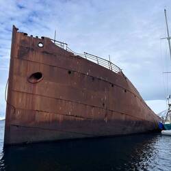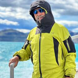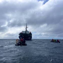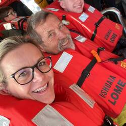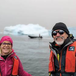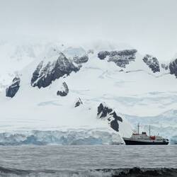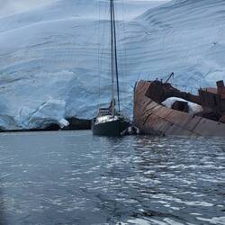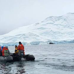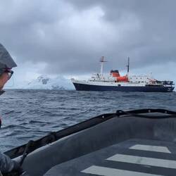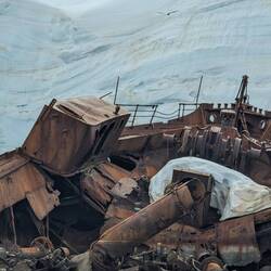 Nach dem Mittagessen fand die erste Ausfahrt mit dem Zodiac statt, also mit diesen schwarzen motorbetriebenen Schlauchbooten. Gestern einigten wir uns schon darauf, dass wir uns mit der kanadischen Familie - Cindy, John und Taylor - ein Boot teilen werden. Es war die richtige Entscheidung, denn wir hatten eine Menge Spaß. Cindy und ich saßen zu beiden Seiten ganz vorne und bekamen die gröbsten Wellen ab. Wir wurden von Kopf bis Fuß abgespritzt, aber dank der guten Regenbekleidung war das kein Problem. Unser Guide an Board war heute Marlena und sie erklärte uns einiges über die Schneezusammensetzung des Gletschers sowie die historischen Überreste des Walfangs. Darüber hinaus fuhren wir zu einem gesunkenen Schiff „Governoren“ und erfuhren die Geschichte, die dahinter steckt. Das Schiff sank 1915 in der Nähe der Enterprise Island im sogenannten Foyn Harbour. Es handelte sich um ein Walfang Schiff, das die Wale direkt an Board verarbeiten konnte. Der Grund für ihren Untergang - laut einer Legende - war eine Laterne die bei einer Party das neu geölte Schiff in Brand setzte. Der Kapitän konnte die Besatzung von ca. 85 Mann aber in einem geschickten Manöver retten.