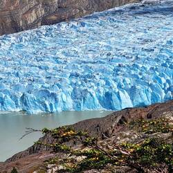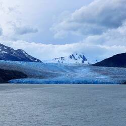 Die sogenannte Kalbungsfront ist 4,4 km lang und hier brechen täglich mehrere kleine bis größere Teile ab. Wenn man Glück hat, stürzt sogar eine Wand ein. Der gesamte Gletscher erstreckt sich über ca. 30 km und hat eine Fläche von rund 250 km².