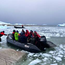 In der Umgebung sahen wir viele Berge und Nunataks, das sind eisfreie, aus dem Gletscher herausragende Felsen. Der Gletscher reicht von der Plateau Eisspitze bis zum Meer. Um zum Landepunkt zu gelangen, fuhren wir durch Eiswasser. Das hört sich total witzig an, wenn man mit dem Boot über die großen Eiswürfel 🧊🧊🧊 fährt 😜. Zeitweise musste der Motor herabgedrosselt und ganz langsam gefahren werden, um Schäden am Antrieb zu verhindern.