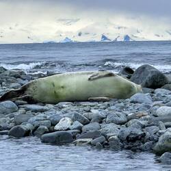 Wir sahen einen einzigen Gentoo Pinguin, auf Deutsch Eselspinguin oder Rotschnabel Pinguin. Eine ganz müde Weddellrobbe lag daneben mit einem grünen Bauch 😜. Wo hat sich denn die wieder reingelegt?