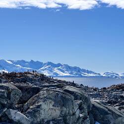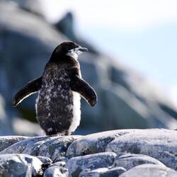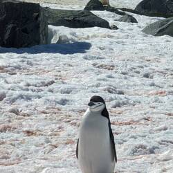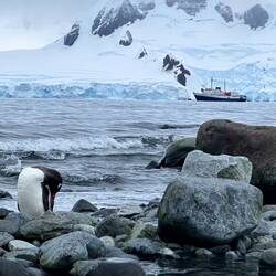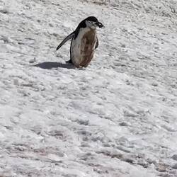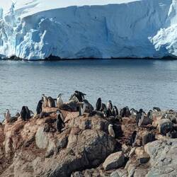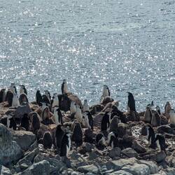 Je näher wir der Insel kamen, desto deutlicher erkannten wir die Zügelpinguin Kolonie mit ihren Straßen, auf denen sie rauf und runter watschelten oder am Bauch - wie mit einem Bob - nach unten rutschten.