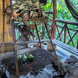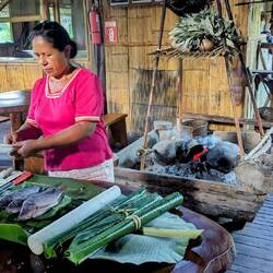 Zurück in der Lodge machen wir direkt mit dem Abendessen weiter. Der Fisch (Tilapia) und die Palmherzen werden zusammen mit einer Prise Salz, Knoblauchblätter und Koriander in hitzebeständige Bijao-Blätter gewickelt. Das Päckchen kommt für 20 Minuten auf's Feuer und fertig. Dazu gibt's ganz klassisch Maniok, Patacones (Kochbanane) und eine Tasse Guayusa-Tee. Die Kichwa-Indigenen trinken diesen Tee seit jeher, um Klarträume und Visionen hervorzurufen. Traditionell findet die Guayusa Teezeremonie um 4 Uhr morgens statt. Bei diesen Zusammentreffen werden die Träume gemeinsam entschlüsselt und die täglichen Aufgaben geplant. Die älteren Gemeindemitglieder geben dabei ihr Wissen an die jüngeren weiter. Darüberhinaus soll der Tee viele weitere Vorteile haben.