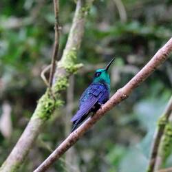 Wir starten bei Zeit, denn morgens ist Schönwetter, nachmittags setzt meist der Regen ein. Mit einem etwas außergewöhnlichen Sessellift, in dem Anschnallpflicht herrscht und gleichzeitig maximal 24 Personen Platz haben, fliegen wir 15min lang über den Nebelwald von Mindo. Klasse Perspektive! Anschließend wird's noch abenteuerlicher, als wir mit der Tarabita in kürzester Zeit weitere 530m über die Baumwipfel gleiten. Auf der anderen Seite angelangt, beginnen wir unsere kurze Wanderung durch den dichten, immergrünen Regenwald, welche uns zu sechs Wasserfällen führt - Santuario de las Cascadas. Alle nicht sonderlich hoch, mitten im Dschungel dafür wunderschön gelegen. Wir baden eine Runde, bevor wir uns schließlich auf den Rückweg machen. Unzählige Schmetterlinge und Kolibris begleiten uns. Und mit ein wenig Geduld gelingt es mir endlich, ein paar zu fotografieren.