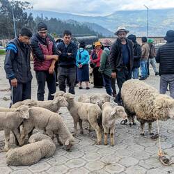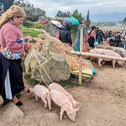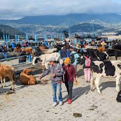 Spannender finden wir jedoch den Tiermarkt. Dort herrscht jeden Samstag ab 6 Uhr reges Treiben. Sowohl Kleintiere wie Kaninchen, Meerschweinchen, Hühner, Enten oder Wellensittiche, als auch große Tiere wie Kühe, Pferde, Schafe, Ziegen und Schweine werden hier gehandelt. Zimperlich wird mit dem Vieh dabei nicht umgegangen. Wir sind weit und breit die einzigen Ausländer und können im Gegensatz zum Textilmarkt ganz ungestört herumschlendern und das laute, farbenfrohe Spektakel auf uns wirken lassen. Die Verkäufer, hauptsächlich Indigene, denken sich wohl schon, dass wir ihnen eher kein Kalb abkaufen werden. Hier ist ganz schön was los. Lauthals werden Preise ausgerufen und überall wird gefeilscht, Kühe werden auf die Ladefläche der Kleinlaster geschoben, Ferkel wehren sich mit ohrenbetäubendem Gequike gegen jegliche Art der Fortbewegung und so manches Tier muss wieder eingefangen werden. In der angrenzenden Markthalle haben einige Tiere bereits in den großen, blubbernden Kochtöpfen ihr Ende gefunden. Eher nicht so unsere Art zu frühstücken. Gegen 8:30 Uhr wird's nach und nach schon wieder etwas ruhiger.