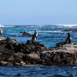 Bei Los Túneles gibt's ein spätes Mittagessen und anschließend erkunden wir die Gegend ein kleines Stück zu Fuß. Die "Zugabe" des heutigen Tages sind ein trächtiges Seelöwen-Weibchen, das uns für kurze Zeit begleitet und ein Blaufußtölpel-Paar, das uns seinen Balztanz aufführt.