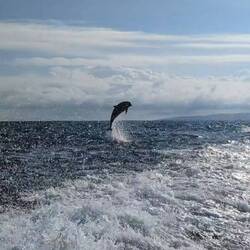 Am Nachmittag geht's weiter. Wir ergattern uns wieder die besten Plätze auf dem Schiff, nämlich ganz hinten. Dort befinden sich die einzigen offenen Fenster und es weht ein angenehmes Lüftchen. Und das i-Tüpfelchen: wir sitzen auf der Poleposition, um die Delfine zu beobachten, wie sie uns ein Stück weit begleiten, im Kielwasser herumtollen und immer wieder aus dem Wasser springen. Es sind bestimmt um die 20-30 Delfine. Und wie groß sie sind. Wow! Kurz vor Sonnenuntergang erreichen wir San Cristóbal.