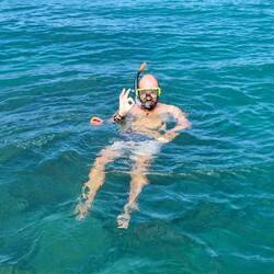 Schon im kniehohen Wasser schwimmen nicht nur sämtliche Fische, sondern auch kleine Riff- und Hammerhaie um uns herum. Irgendwo schnappe ich auf, dass weiter draußen größere Haie sind und da diese traumhafte Bucht ohnehin zum kajaken einlädt, nichts wie los. Es dauert nicht lang, bis die erste, schätzungsweise 1m lange Schildkröte ganz gemütlich an uns vorbei schwimmt. Auch die vielen Rochen lassen nicht lange auf sich warten und die Haie sind ebenfalls da, wobei die wesentlich schreckhafter sind als die anderen Tiere. Wir sind nie lange allein, überall gibt's irgendwas zu sehen. Erstklassig, das übersteigt unsere Erwartungen. Wie gut, dass wir immer die Schnorchelausrüstung dabei haben. Um ehrlich zu sein, ist die Sicht unter Wasser jedoch weniger gut als wir uns das im Voraus vorgestellt hatten.