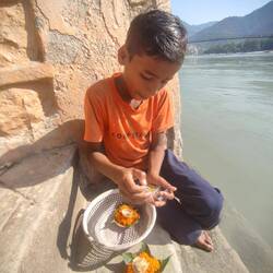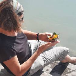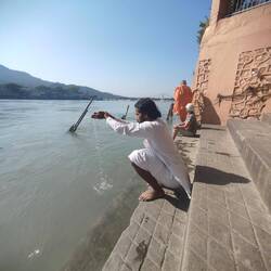 Als gemeinsames Morgenprogramm führte uns Kavita zum Haus, in dem Shivananda seine letzten Jahre gewohnt hatte. Seine Erdgeschosswohnung war großteils noch original eingerichtet- mit Schränken und Vitrinen, in denen seine Kleidung ausgestellt war, sein Wohnraum, der Rollstuhl , sein Bad und auch sein Schlafzimmer, in dem er offenbar auch gestorben war. Als er noch mobil war, konnte Shivananda von seiner Terrasse aus über seinen eigenen Zugang - ein kleines Ghat - direkt zum Ganges gelangen. Auf den Stufen sahen wir ein paar Hindus, die dort badeten oder innig beteten - siehe Bilder. Auch wir setzten uns hier einige Minuten hin. Als ein Junge mir mehrfach - sehr aufdringlich - ein Blumenschiffchen anbot, das ich im Ganges schwimmen lassen sollte, ließ ich mich dazu überreden. Ich handelte ihn von 500 Rupien auf 200 (oder 250?) herunter und er drehte mir einen Docht für das Öllicht. Ich schickte das Boot mit guten Wünschen für die sichere Rückreise der anderen und für meine gute Weiterreise los. Das hat ja dann auch funktioniert... ;-) Auch wenn die anderen- besonders Kavita - entsetzt waren und meinten, ich hätte ihm höchstens 20 - 50 Rupien geben dürfen.