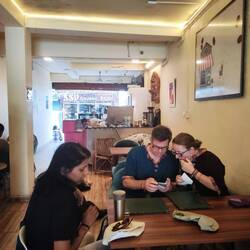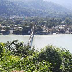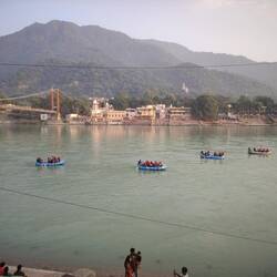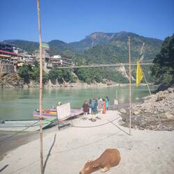 Wir gingen zu Fuß weiter bis fast zur gesperrten Laxman-Jhula Brücke an die Stelle, wo man mit großen und kleinen Fährbooten auf die andere Gangesseite übersetzen kann. Wir teilten uns ein kleines Motorboot, das uns in ca 2 Minuten hinüberbrachte. Dann gings direkt zur German Bakery, in der uns Anja und Achim zum Abschiedskaffee einluden. Danach gings ganz rasch zurück auf dem selben Weg, da Karin noch vor dem Mittagessen ihre Sachen final packen musste. Um 13 Uhr sollte sie auschecken. Sie hatte schon für heute Nacht den Rückflug von Delhi gebucht. Ich leistete ihr bis nach 15 Uhr Gesellschaft beim Warten aufs bestellte Auto /Taxi. Internet gibt es in diesem Ashram nur vor der Bibliothek, so dass wir hier auf Mäuerchen saßen. Dabei mussten wir uns sehr vor den Affen in Acht nehmen, die in Scharen überall herumturnten. Unter anderem auf einem geparkten Motorrad (siehe Foto und Video). Es dauerte nochmal fast eine Stunde bis sie und Kavita endlich los kamen. Kavita fuhr bis Haridwar mit, weil sie sich in Haridwar bei ihrer Mutter absetzen lassen wollte, um ihr Gepäck dort unterstellen zu können. Sie würde erst am nächsten Morgen zurückkommen, um uns drei übrige noch zu zu verabschieden. Anja und Achim kamen gerade stolz mit ihren Einkäufen zurück (u.a. zwei Götterstatuen - Ganesha für ihn, Kali für sie), als ich loszog, um mir eine neue Unterkunft zu suchen - und auch zu buchen. Ich wollte mir zuerst das Shalom Backpackers Hostel anschauen, das recht gute Bewertungen bei Lonely Planet hat. Es war ein ziemlich weiter Fußmarsch die steile, stark befahrene, sehr laute Hauptautostraße entlang. Unterwegs sprach mich ein Motorradfahrer an und bot an, mich bis oben mitzunehmen, was ich gerne annahm. Oben angekommen, musste ich aber länger suchen, da die Googlemaps-Angaben bei Google maps unklar und fehlerhaft waren. Als ich wieder mal in einer Sackgasse 1200m Luftlinie vom Shalom Backpackers gelandet war und mir selbst die indischen Männer, die hier in einem Restaurant arbeiteten, nicht weiterhelfen konnten, sprach ich einen amerikanischen Physiotherapeuten an, der auch alleine unterwegs war. Er versuchte es nun mit seinem Handy-Navi und begleitete mich bis zu dem einzigen, unscheinbaren Schild zu Beginn der Touristenzone, auf dem das "Shalom Backpackers" angeschrieben war. Dort verabschiedeten wir uns und ich eilte zum vermeintlichen Eingang des Hostels. Hier war aber nur der Zugang zu einem kleinen Yogastudio. Der Yogalehrer brachte mich über einen Gang und Stufen ins quasi angeschlossene riesige Hinterhaus zur Rezeption. Gloria! Nachdem ich ein leeres Zimmer besichtigt hatte, das groß war und ein eigenes Bad hatte und ich die Zusicherung, dass ich ab morgen ein ähnliches bekommen könne, reservierte ich für 4 Nächte und zahlte schon mal 2 Nächte an. Nun musste ich mich sehr beeilen, um rechtzeitig zum Abendessen im Ashram zurück zu sein. Nach dem sehr einfachen Abendessen mussten Achim, Anja und ich unsere Sachen packen. Ich war sehr froh, dass ich mit der neuen Unterkunft wenigstens Schritt 1 für meine "Alleineweiterreise" auch alleine erfolgreich bewältigt hatte!Weiterlesen