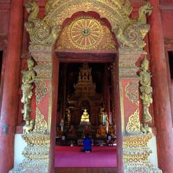 Nach der kleinen Pause begab ich mich noch auf eine kurze Shoppingtour bevor ich mir den letzten Tempel für heute ansah und zum Wat Phra Singh spazierte. Dieser wurde im Jahre 1345 gegründet und erhält durch seine Buddha-Statue Phra Phuttha Sihing eine besondere Bedeutung. Sie ist eine von thailandweit drei Statuen, denen nachgesagt wird, einer verlorenen Statue aus dem Mahabodhi-Tempel Bodhgaya und Indien zu ähneln. Diese soll von Indien über Ceylon (das heutige Sri Lanka) nach Ligor (das heutige Nakhon Si Thammarat in Thailand) und von dort nach Ayuthhaya gelangt sein bevor sie endgültig in Chiang Mai eine Heimat fand. Jedes Jahr zum thailändischen Songkran Fest wird die Statue aus dem Tempel gebracht und in einer prächtigen Prozession durch die Straßen geführt. Hierbei ist es Sitte, dass die Gläubigen die Statue mit Wasser bespritzen und damit ihrer Verehrung Ausdruck verleihen.
