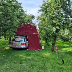 Heute haben wir unser Zelt zwischen Apfelbäumen aufgeschlagen. Da werden wir heute mal den hier produzierten Apfelsaft probieren.
