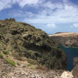 Da die Landschaft recht karg ist, könnt ihr auf den Fotos nicht erkennen, wie windig es ist… allenfalls anhand der Wellen. Aber (auch) wegen des Windes gehe ich nicht den Felsen hoch und halte mich nicht all zu lange dort auf. Ein paar Fotos mit Blick auf den Barranco und Playa del Juncal sind wegen des Gegenwindes recht unscharf geworden.