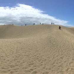 Wir sehen viele Menschen, die dennoch querfeldein gehen, die Dünen runterlaufen, manche scheinbar auf bestehenden Wegen gehen (Markierungspfähle entdecken wir dort aber nicht). Auch ich schwimme mit dem Touristenstrom und gehe 100 m über den sehr warmen Sand auf einem scheinbar vorhandenen Weg, um ein paar Bilder zu machen.