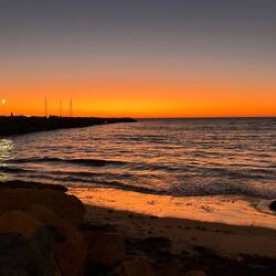 Ich gehe nochmal raus und setze mich mit meinem Abendessen ans Wasser. Die Sonne ist schon untergegangen, aber es ist noch ein roter Streifen am Horizont.Read more