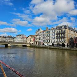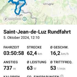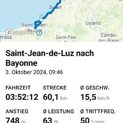 Entgegen der Wetterprognosen war die Fahrt heute überwiegend trocken. Kurz vorm Ziel hat uns dann ein deftiger Schauer erwischt. Die Fahrt ganz ohne Maut führte uns durch Bayonne und Biarritz.Les mer