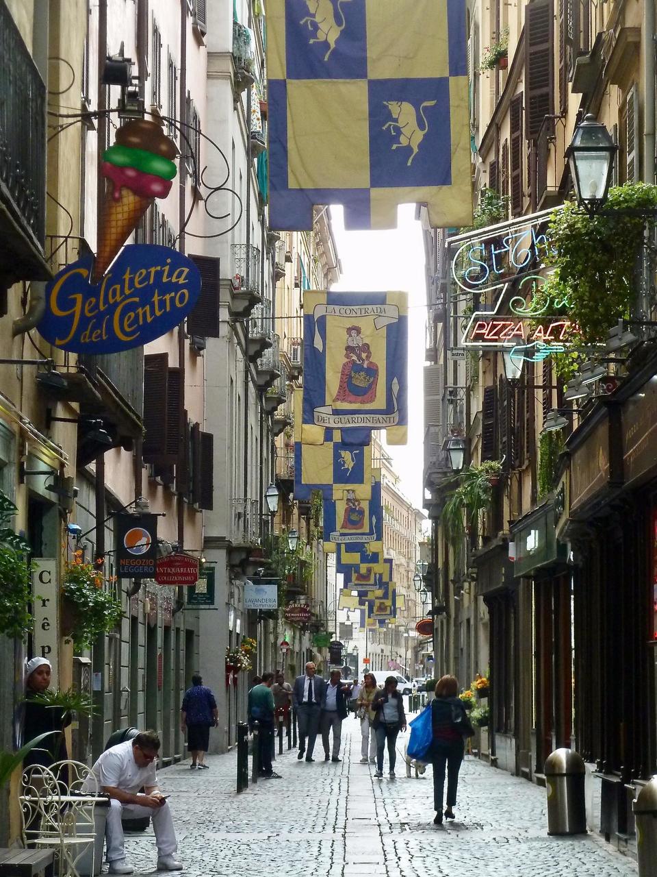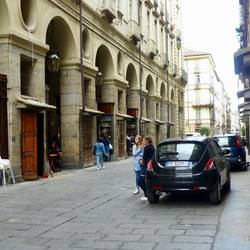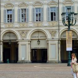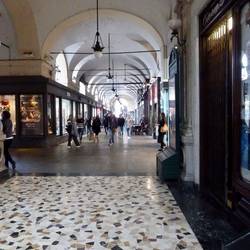 Shopping in Turin is walking along marble cloisters around huge piazzas. This area often has inclement weather, hence the need to be undercover.