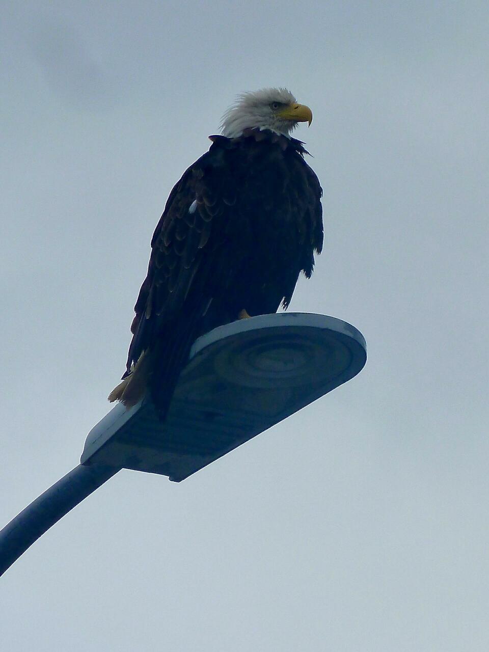 Outside Safeway, atop a roadside lamppost sat a Bald Eagle watching the traffic closely.