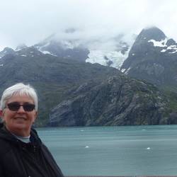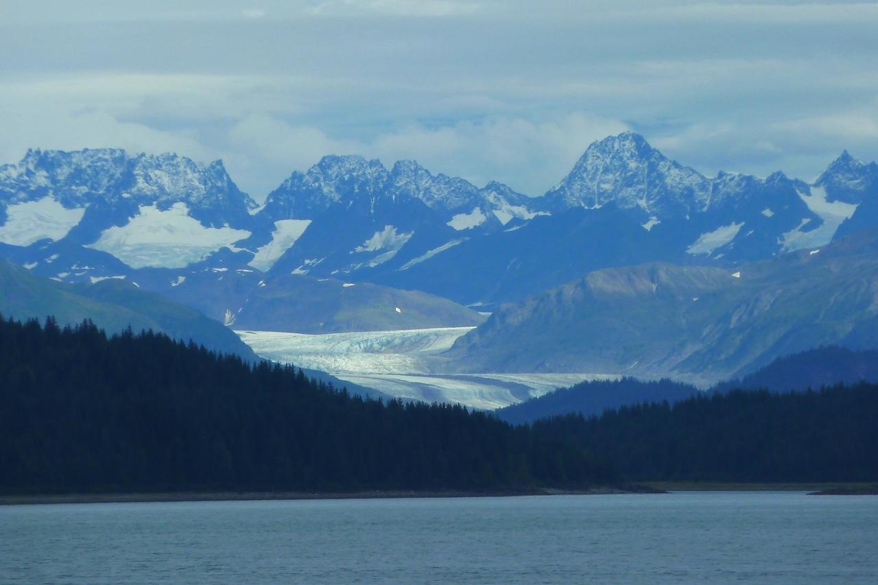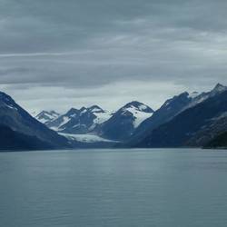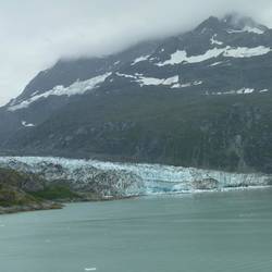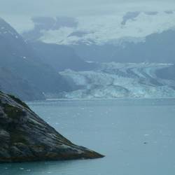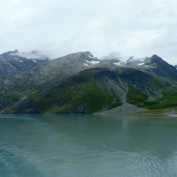 We have just entered Glacier Bay. The wind has calmed and the sea is just choppy. The land rises straight up and the higher peaks have a dusting of snow from the past few days.