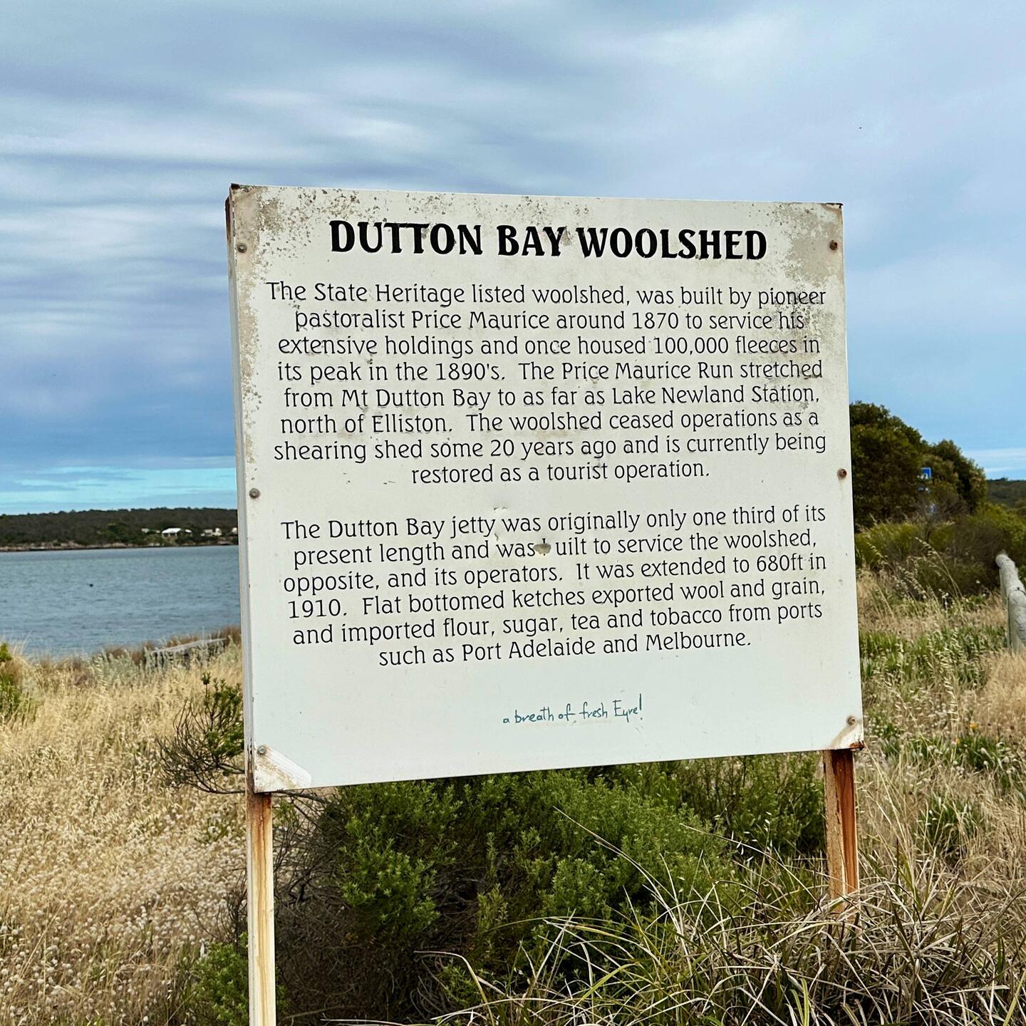 The Dutton Bay Jetty was a privately owned facility where ships could load the wool and grain from the Dutton Bay Farm. Oysters and other shellfish are found in the shallow waters edge.