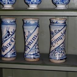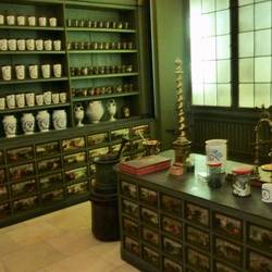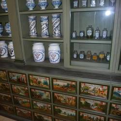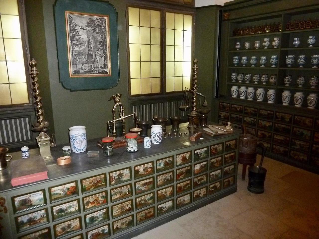 A typical pharmacy from the mid 18th century. The basic ingredients for remedies were kept here in jars and drawers.