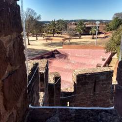 Today Silves is an attractive town dominated by one of the best-preserved castles in the Algarve, built between the 8th and 13th Century. It was restored in the 20th century. The Moorish Fortaleza, which boasts a complete set of red sandstone walls and detached towers, occupies twelve thousand square meters on top of the hill that overlooks the town. Iron Age remains have been found, along with a well, a governor's palace and the Cisterna Grande, a thirteenth century water cistern that once served the whole town.”