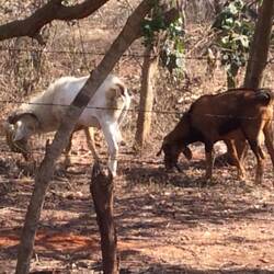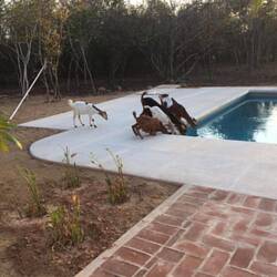 Neighbours own the goats, but for years before the house was built, cows and then goats were allowed to roam the jungle and that property for food and possibly water. The owners would open their pens and let them roam. No damage to anyones property. But now someone owns the property that the goats always foraged in. There is a new house with landscaping and a swimming pool - easy food and water.