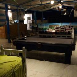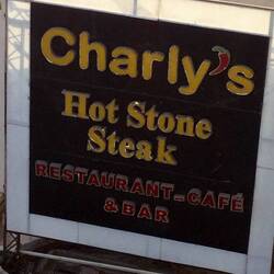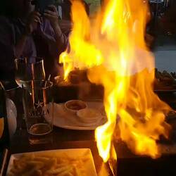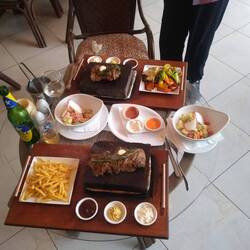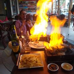 The dinner was amazing. We ordered an appetizer of mussels that came with yummy bread and dips as well as a glass of white wine and a big bottle of Stella beer. Then a big plate of grilled vegetable, two salads and another big plate of French fries arrived. This was followed by two raw steaks - one 300g and the other 350g. - sitting on a heated brick-sized black rock. We hardly had any room left on our table! The idea was that the waiter would pour alcohol on the steaks and light them on fire to seat them and the hot stones would cook them to our preference. It was great!