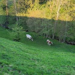 Strahlende Sonne und Temperaturen bis 27 Grad... hier findet die erste Mahd statt und die Kühe sind vor der Haustür!