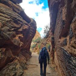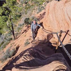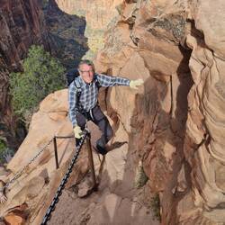 Die erste Stunde geht es in Serpentinen steil bergauf, dann eine halbe Stunde durch eine enge Schlucht, anschließend noch einmal fast eine Stunde in noch engeren Windungen aufwärts. Erst danach haben wir den Kontrollpunkt der Ranger erreicht, ab hier geht es nur noch mit "permit" weiter. Uns wird schnell deutlich, warum: Der Pfad ist zwar gut durch Ketten gesichert, aber extrem steil, teilweise ausgesetzt und verläuft immer am Abgrund. Hier können die Wanderer nur an wenigen Stellen sicher aneinander vorbei.