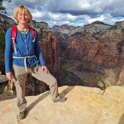 Der nächste Nationalpark trägt denselben Namen wie das gelobte Land, weil es den ersten Siedlern nach endlosen Planwagenkilometern durch wüstengleiche Wildnis wie der Himmel auf Erden vorkam: Es gibt den Virgin River - also Wasser - , es gibt fruchtbaren Boden, es gibt Schatten vor der sengenden Sonne und ehrfurchterregende Felsformationen, die auch gleich biblische Namen bekommen: Abraham, Isaac und Jacob Peak, sowie Angels Landing, das seinen Namen aus der Annahme speist, dass nur Engel dorthin gelangen könnten, so steil sind die Abhänge des Berges.