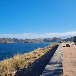 Am Nachmittag gegen 14:00 Uhr, für unsere Verhältnisse also früher als sonst, fangen Jörg und ich an zu kochen: Es soll heute Melone zum Nachtisch geben, die ich als erstes vorbereite. Dabei stellen sich Bienen ein, die augenscheinlich am Fruchtfleisch interessiert sind. Während des weiteren Kochvorgangs (Nudeln mit scharfer Paprika-, Zwiebel-, Tomatensauce) nimmt die Bienenzahl so zu, dass wir beschließen, zum Essen neben das Auto in den Schatten und Wind zu rücken. Das hat Erfolg: Wir genießen unbehelligt unsere Mahlzeit. Doch am Ende, als wir uns wieder unserem Auto zuwenden, sehen wir, worum es den Bienen eigentlich gegangen ist: Eine neue Heimstätte. Hunderte bevölkern den Innenraum, vor allem die Gaze im Schlafzimmer. Wir öffnen alle Fenster, damit der Wind, der dann durch das Auto fegt, sie vertreibt. Das Resultat ist erschreckend: Jetzt fliegen sie durch diese Öffnungen zusätzlich hinein und quetschen sich zwischen die Scheiben der seitlichen Schiebefenster. Es bleibt nur eines: Flucht! Jörg setzt sich hinter das Lenkrad - am Steuer vorn ist noch Luft und Licht, doch hinten bei mir, da lagert sichs dicht (nach Fontane) - ich stehe an der offenen Hecktür und wedele während der Fahrt mit dem Geschirrtuch die Auto-Besetzer aus dem Wagen. Mit einem Messer pule ich die hartnäckigen Viecher zwischen den Fenstern heraus und wedele wieder. Ich bin froh, dass die Offroadstrecke verhältnismäßig eben ist. Als wir unser rollendens Heim wieder für uns allein haben, kehren wir um. Doch Grobi bleibt Bienenanziehungspunkt, obwohl wir den Lagerplatz, an dem noch Bienen herumschwirren, nicht wieder mit ihm aufsuchen. Geschirr, Tisch und Stühle tragen wir deswegen zum Auto zurück, verstauen alles und fahren ab. Der nächste Lagerplatz ist zwar nur 10 km entfernt, trotzdem wird es Nacht, bevor wir ihn erreichen: Offroadstrecken fahren sich nicht so schnell - vor allem nicht im Dunkeln.