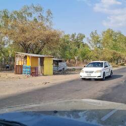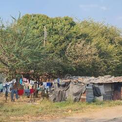 Wir fahren durch karges Hügelland. Auf den trockenen, beige-braunen Weiden stehen magere Kühe. Der Straßenrand ist vermüllt. Neben hübschen, farbig gestrichenen, einstöckigen Häusern stehen Wellblechhütten und Häuser, die ein Gerüst aus 2m langen Söckern haben, zwischen die Lehm geschmiert wurde. Allen Häusern gemeinsam ist die Hängematte im Schatten vor dem Eingang.
