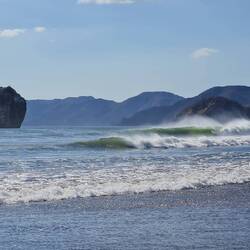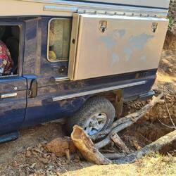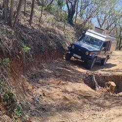 Costa Rica empfängt uns mit warmen Armen. Ist es unsere positive Grundeinstellung diesem wunderbaren Land gegenüber oder ist das Leben hier tatsächlich leichter? Wir fühlen uns sofort so sicher, dass wir schon in der ersten Nacht am Pazifik frei stehen und entspannt den Sonnenuntergang verfolgen, gemütlich Essen gehen und trotz Wärme gut Schlafen. Am nächsten Tag gondeln wir zu verschiedenen traumhaften Buchten und ich verleite Jörg zu einer Offroadtour, die sich spektakulär entwickelt. Der Weg ist schmal und windet sich steil aufwärts. Grobi ist in seinem Element: Mit Allrad und Untersetzung krabbelt er scheinbar mühelos den Hang aufwärts. Doch dann sehen wir, dass die Strecke in einer Kurve an der Innenseite weggebrochen ist, an der Außenseite ist ein Steilhang. Grobi kommt selbstständig zum Stehen - selbstständig? ... Ja, er geht aus. Von allein. ... Da wir sowieso anhalten wollten, um die Straßenlage zu begutachten, machen wir uns noch keine Gedanken und entscheiden uns für die Weiterfahrt: Das müsste passen - vielleicht wird es knapp - ich weise Jörg ein. Doch Grobi springt nur zögernd an und bleibt nach 2m wieder stehen. Weiß er schon, dass es nicht passen wird? Oder gibt Jörg zu wenig Gas? Es ist ja immer noch sehr steil ... . Mehr Gas! Das führt dazu, dass Grobi sich widerwillig in Bewegung setzt, aber in dem Moment, in dem die Traktion am wichtigsten wäre - als das Hinterrad in der Innenkurve dem Loch nahe kommt - versagt der Wagen den Dienst und das Hinterrad rutscht unweigerlich in die Ausspülung. Der Wagen ist aus. Die Blattfedern liegen auf. Das rechte Vorderrad schwebt. Das Hinterrad hängt frei. Jetzt gibt es noch die Differenzialsperren als letzten Joker, bevor wir den Greifzug einsetzen. Während ich mich schon nach einem geeigneten Baum umsehe und überlege, wie ich am Auto vorbei komme, um den Greifzug zu holen, legt Jörg die Sperren ein und versucht den Wagen zu starten. Nichts! - Noch einmal ... ... ... . Grobi will nicht. Er hängt in misslicher Lage und weigert sich.