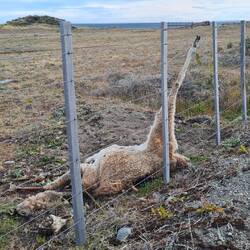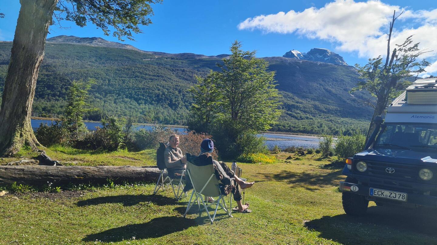 Wir nähern uns der Magellanstraße. Auf dem Weg dahin arbeiten wir uns an Zäunen ab, die uns zwar nicht das Leben kosten, aber den Zugang zu windgeschützten Übernachtungsplätzen verwehren: Unser Dachzelt soll uns bitte nicht bei einer der starken Böen reißen und der Patagonienmodus - Dachzelt bleibt geschlossen - garantiert eine Enge, die dem erholsamen Schlaf nicht förderlich ist. Auf unserer Suche sehen wir, wie gut es uns geht: Wir hängen nicht tot im Zaun, wir sind nicht mit dem Schiff havariert und mussten auch keine Estanzia verlassen, weil der Wollpreis einbrach. So sind wir froh, als wir schließlich einen windgeschützten Platz direkt an der Straße entdecken, der uns ein idyllisches Frühstück auf der angrenzenden Schafweide beschert.
