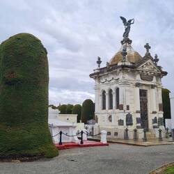 Das schlossähnliche Gebäude der Familie Mendoza- (Besitzer der ehemaligen Schaf-Estanzia, die Ihr aus dem vorherigen Blogeintrag kennt) ist leider noch bis 2026 geschlossen, dafür können wir uns den Prunk dort nach dem Besuch des Friedhofs gut vorstellen: 2 Mausoleen der Familie, eins in barocker Ausführung, das andere in elegantem schlicht-schwarzem Marmor, stehen in Kontrast zu den eher ärmlichen Gräbern der "Deutschen Kranken Kasse" (sic).