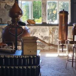 Anschließend besuchen wir eine kleine Gindestillerie, deren Produkte internationale Auszeichnungen vorweisen können. Wir erstehen eine Flasche und besuchen noch den Ort, an dem das Foto auf der Flasche aufgenommen wurde.