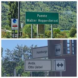 Puerto Puyuhuapi (gesprochen: Pwe - oo - wa - pee) wurde von 3 deutschen Auswanderern gegründet. Vor Ort errichteten sie eine Teppichfabrik. Die Arbeiter waren Mapuche - Indigene von der Insel Chiloe -, die auch nach Schließung der Fabrik vor Ort blieben. So entstand eine lustige mapuche-deutsche Mischgemeinde: Die Straßen- und auch ein Brückenname sind auf deutsch, der Ortsname ist Mapuche und bezieht sich auf einen Speisefisch. Die Einwohner sind Mestizen.